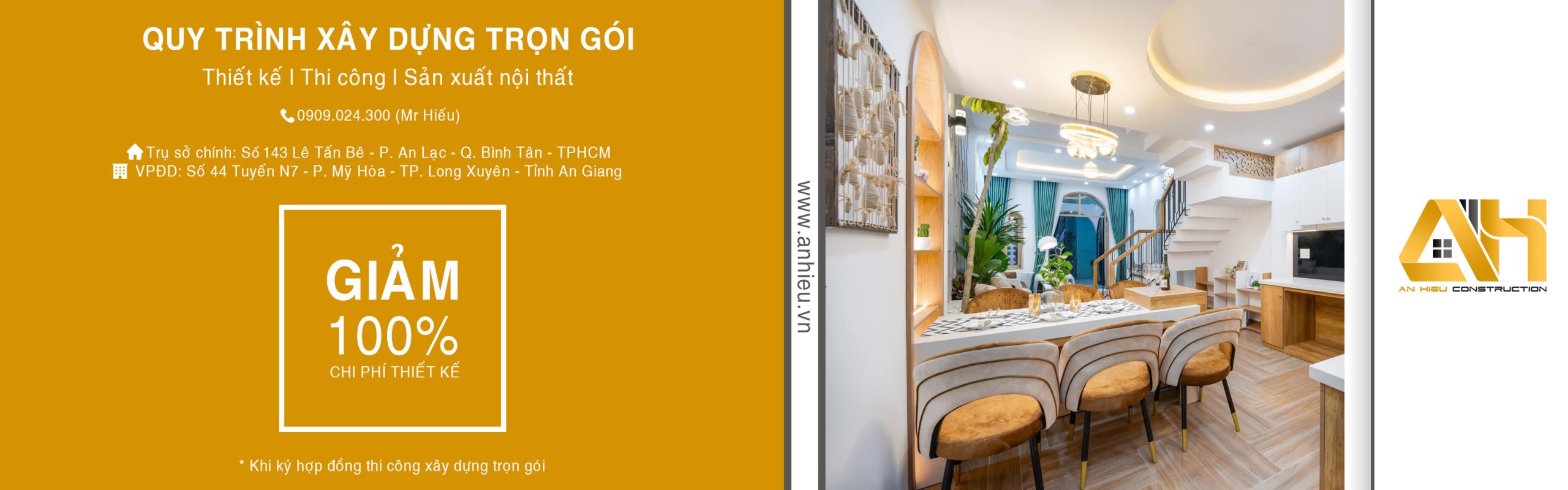 Công ty TNHH Tư Vấn Thiết Kế và Xây Dựng An Hiếu chuyên tư vấn thiết kế – nội thất và thi công trọn gói các công trình nhà phố, biệt thự,… tại TP. Hồ Chí Minh, TP. Long Xuyên (tỉnh An Giang) và các tỉnh Đồng bằng sông Cửu Long.
