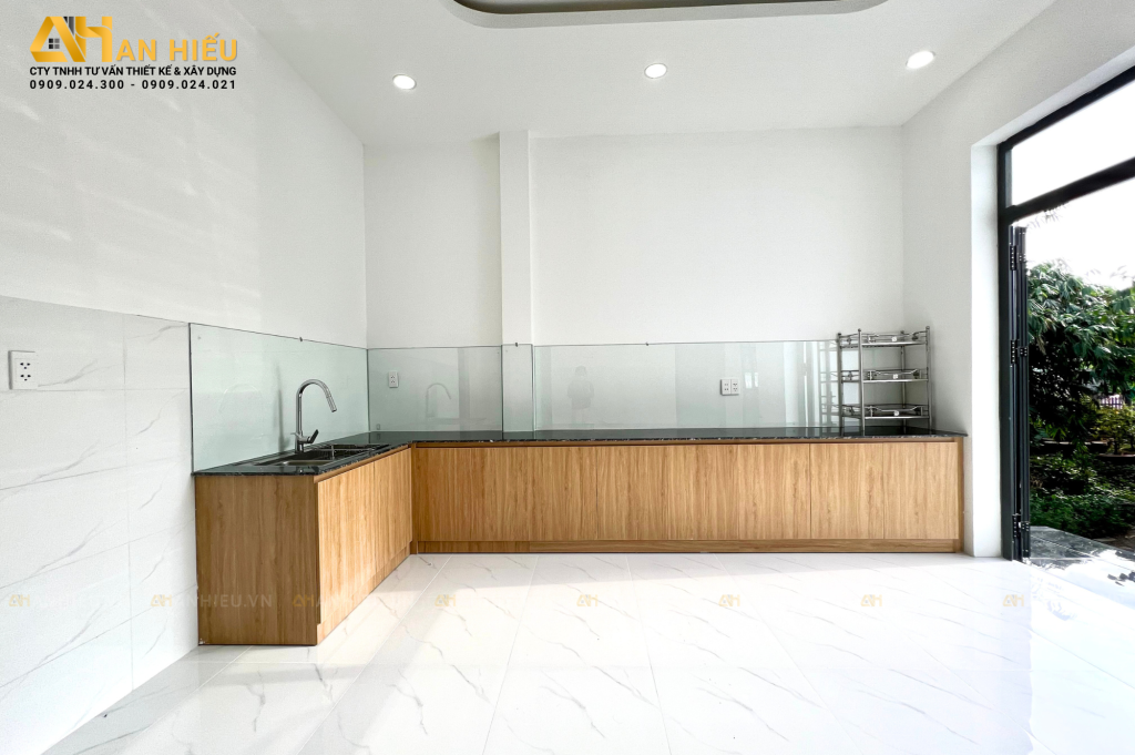 Bếp được bố trí gần cửa sau và khu sân sau để thoát mùi tốt, giúp không gian luôn sạch sẽ, thông thoáng.